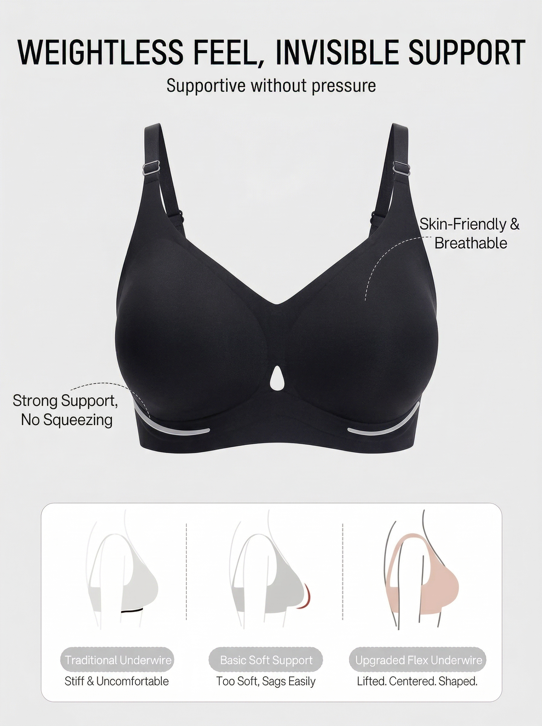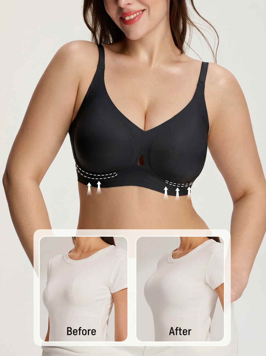 A flexible support structure lifts and stabilizes your bust while staying soft and wire-free.